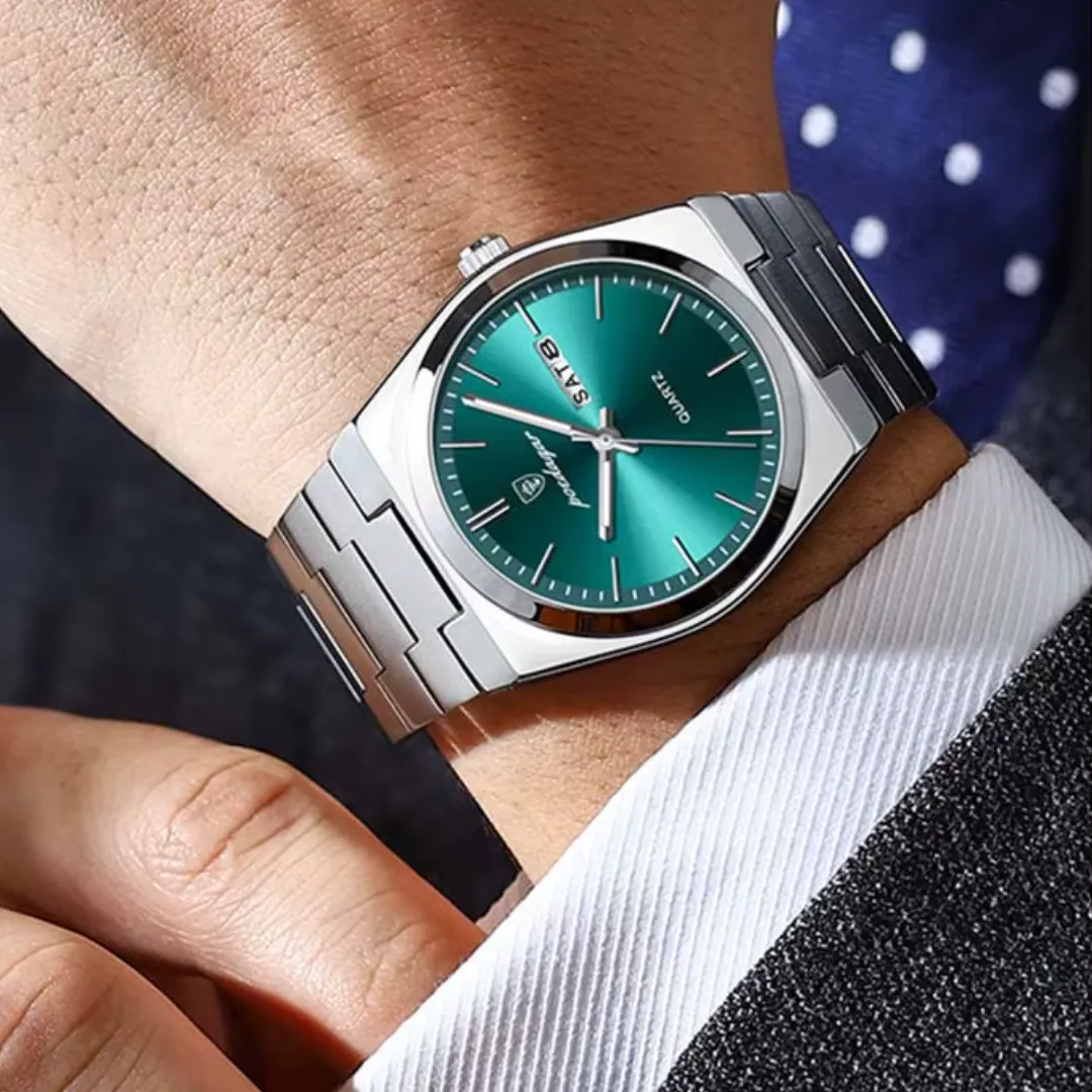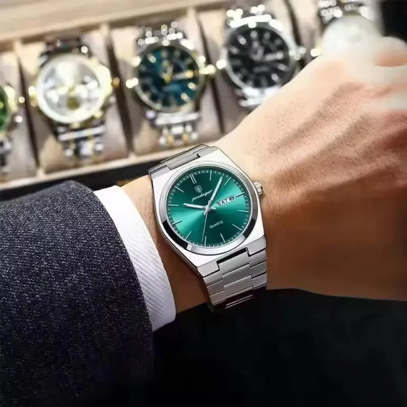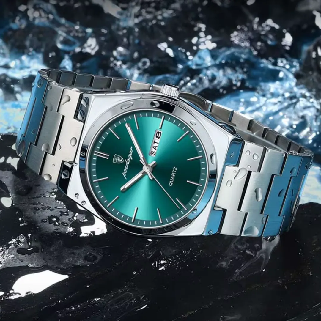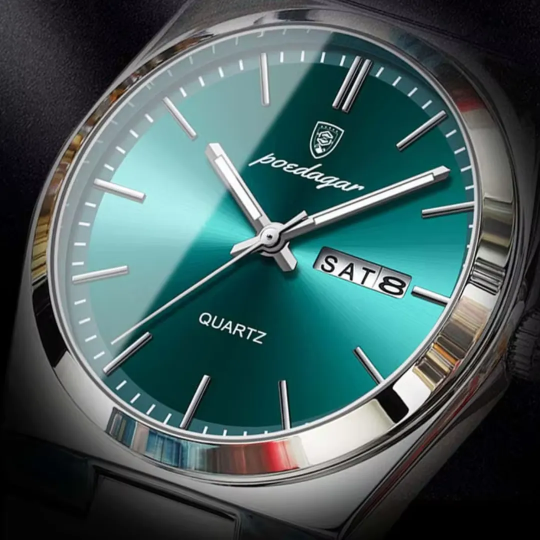With a striking green dial and stainless steel build, the Poedagar 930 adds sophistication to any look while keeping you stylish and on time, day or night. Luminous hands ensure you can read the time in any light, while the complete calendar feature keeps you organized and punctual. Built to last with durable stainless steel, this watch withstands daily wear and keeps looking pristine. Plus, its water-resistant design offers peace of mind, so you're ready for anything, no matter the weather.